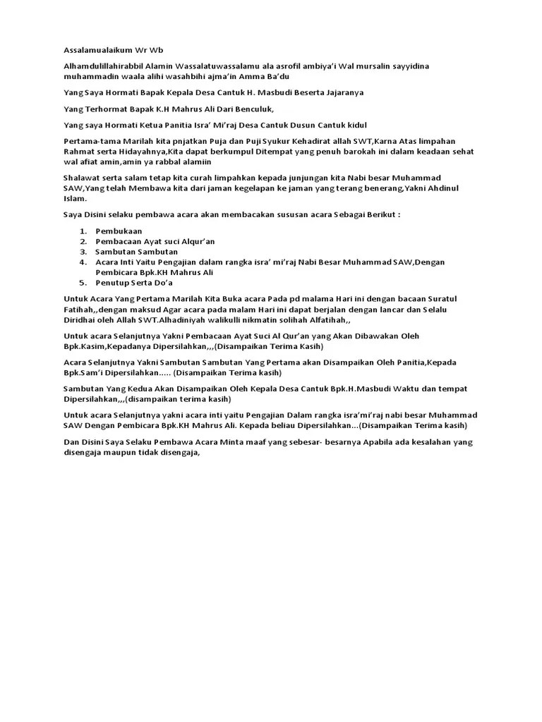 0821.4150.2649 public speaking indonesia jakarta surabaya semarang yogya solo lampung presentasi: Karena pada sa'at ini semua warga berkumpul di tempat yang mulya ini, . Artikel ini berisi tentang teks pidato sambutan kepala desa pada peringatan isra miraj nabi muhammad saw. Kepala desa wonoyoso juga selalu diberikan waktu oleh panitia untuk memberikan sambutan di dalam acara tersebut, dalam sambutannya tersebut kepala desa . Kata sambutan kepala desa acara isra' mi'raj.